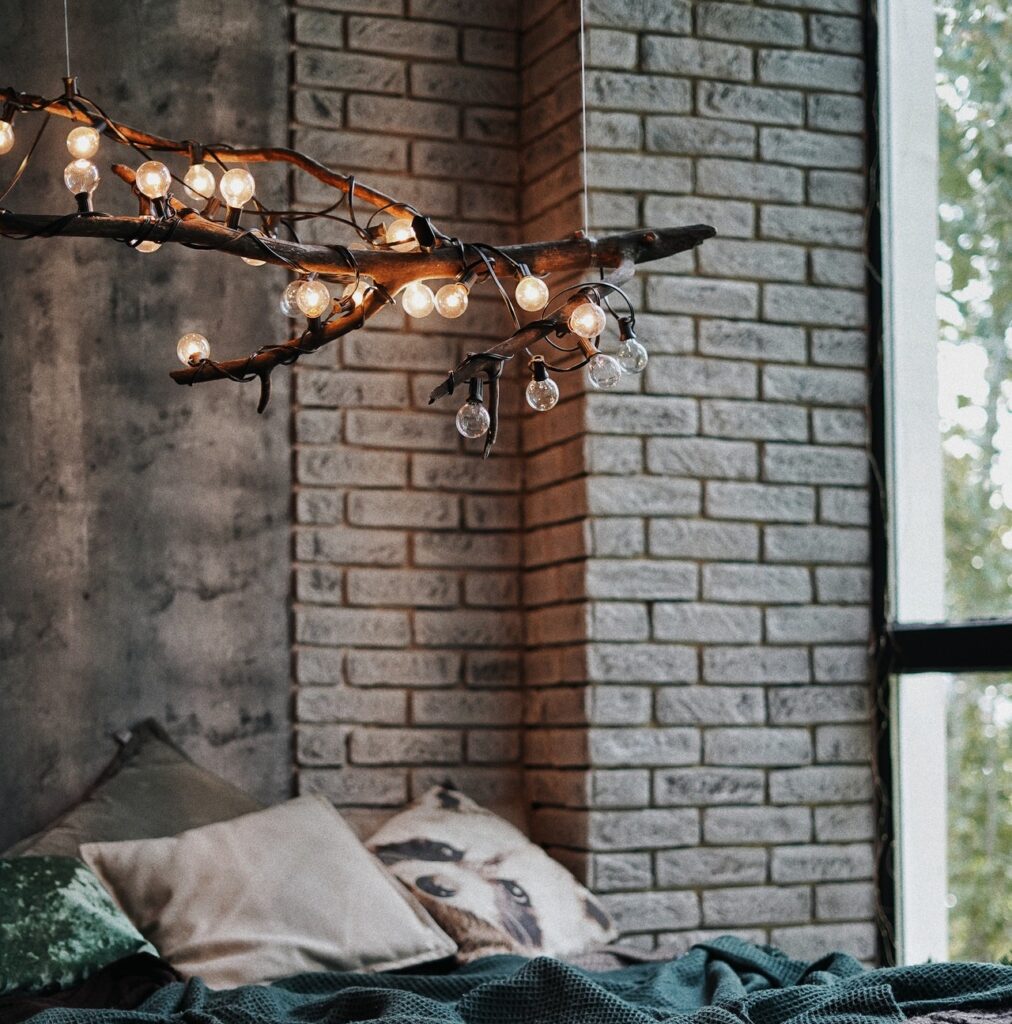 Here’s a natural take on a pendant light. A string of white bulb lights wrapped around a tree branch adds a little fairy magic to a simple, gray room. It’s suspended from a cable in the ceiling to create a “floating” effect.