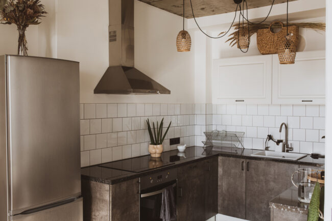 Going with darker textured cabinets was a bold move here. They almost look like they were carved straight from a mountain! In another space, they might look more industrial, but with the wicker pendant and basket, the white tiled backsplash, and the plants for accessories, it gives modern organic. The sharpness of the hard edges and metallic textures is softened by the natural textures and shapes throughout the space, like the draped pendant lighting – a smart choice that balances the design and makes it easier to see what you’re doing while you prep dinner.