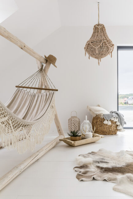 This boho-coastal nook is just what the doctor ordered for some me-time. We love a good hammock – and this one is just begging to be relaxed in. The driftwood frame with the macrame hammock turns this space from an empty white corner into a light and airy refuge. The beaded chandelier is an unexpected twist that ties perfectly with the accessories, making this nook feel like it’s just a few steps away from the beach.