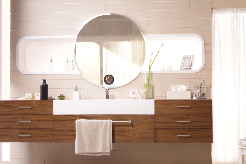 If you watched Mad Men more in awe of the décor than Don Draper, then a bathroom in a mid-century modern style is right up your alley. Tapered legs and natural wood tone vanities combine with colors like olive green, rust, soft pink, or blue.